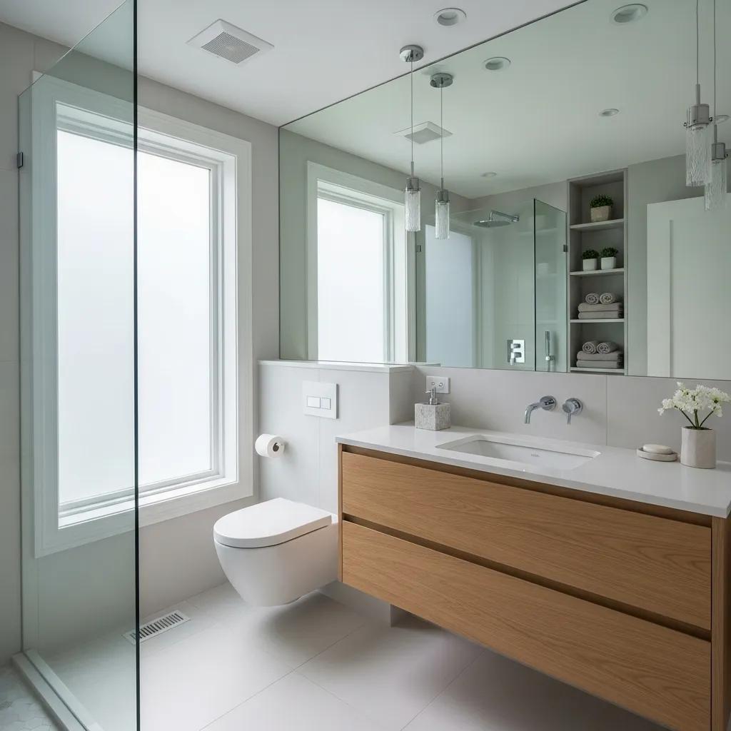Visual strategies—mirrors, color, lighting, and glass—help a compact bathroom feel larger without changing the footprint. Large mirrors increase perceived depth by reflecting light and the room itself; light palettes reduce visual mass; frameless glass enclosures remove sightline breaks. Below are effective, practical tactics homeowners can apply during a remodel.
